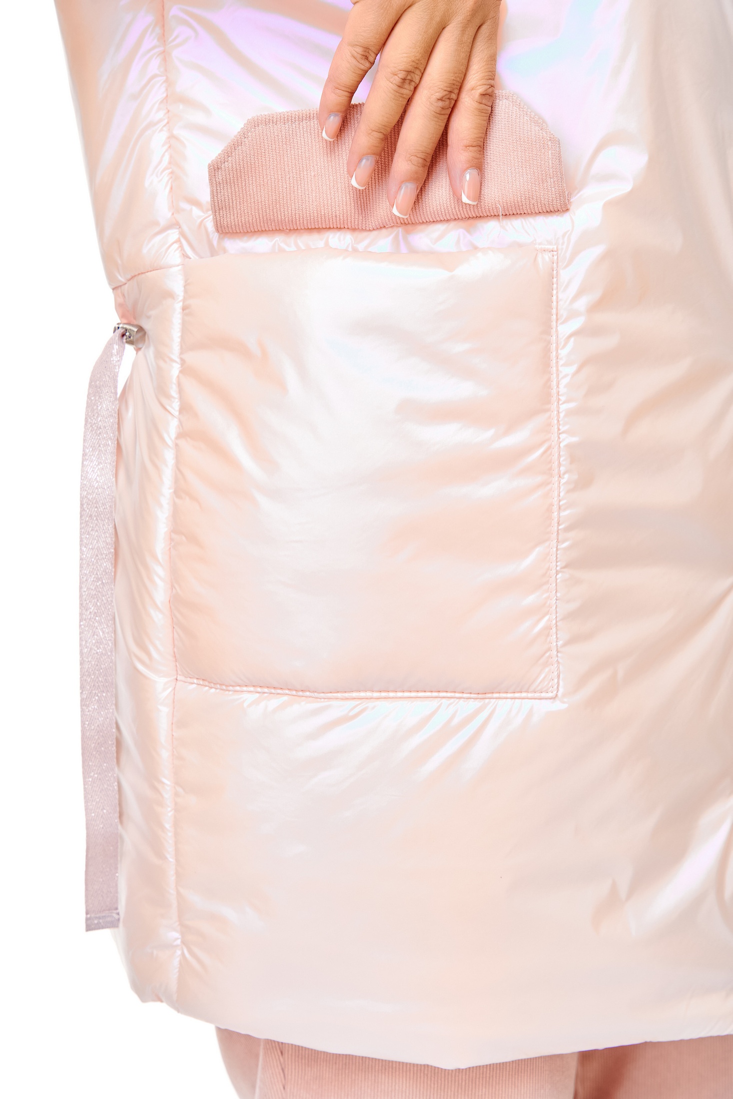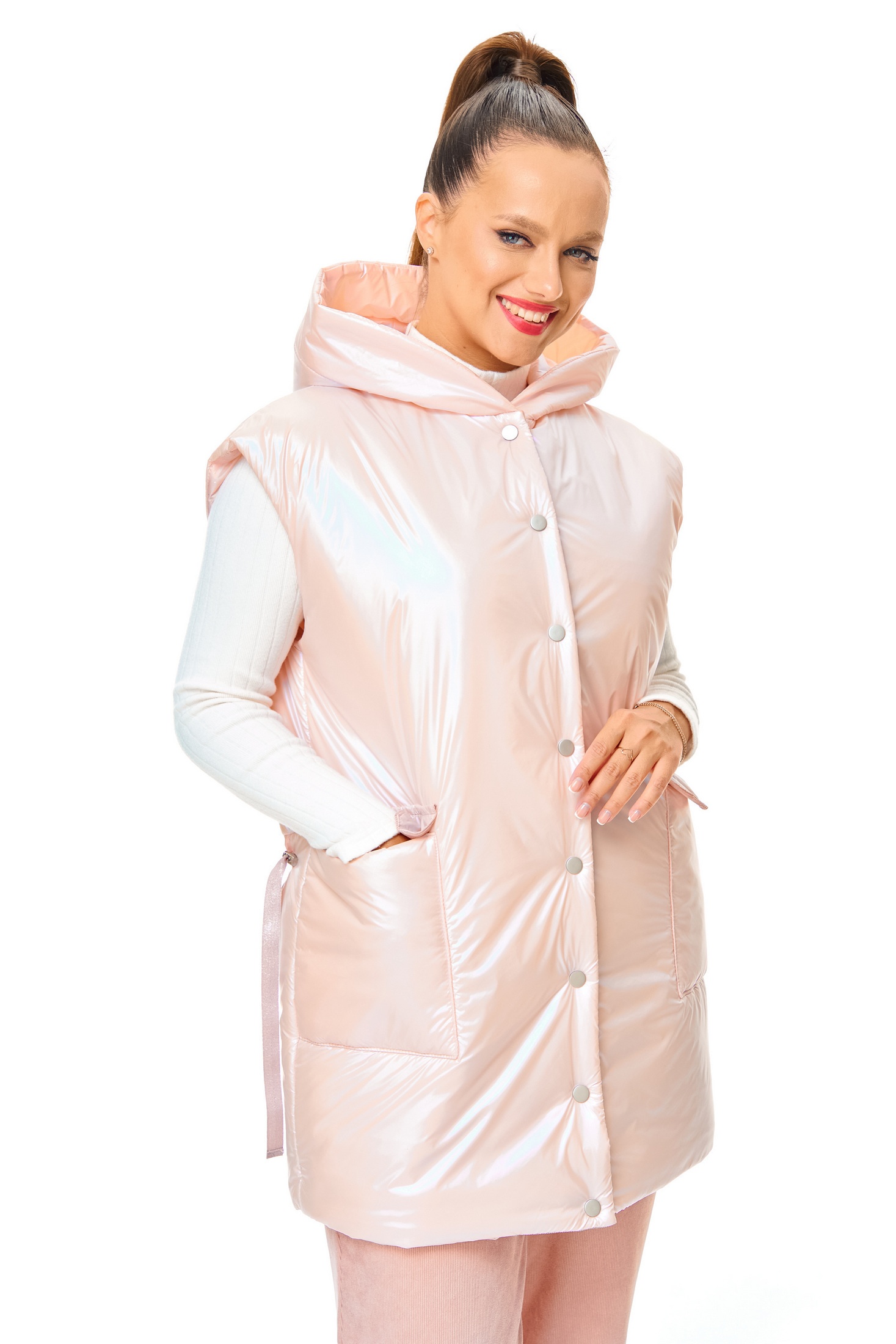 Удлиненный жилет с глубоким капюшоном на легком утеплителе синтепон. Застежка на кнопки. По переду накладные карманы с клапаном. Низ затягивается на кулиску. Жилет на подкладке. Длина размер 52-54 78 см. Окружность по груди размер 44-46 116 см 48-50 120 см, 52-54 124 см