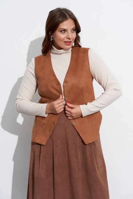 Жилет полуприлегающего силуэта, с фигурным низом переда и спинки. Спереди обработан V-образный вырез горловины, талиевые вытачки и карманы с листочками. Спинка со средним швом и подрезом с эластичной тесьмой в области талии. Изделие на подкладке.