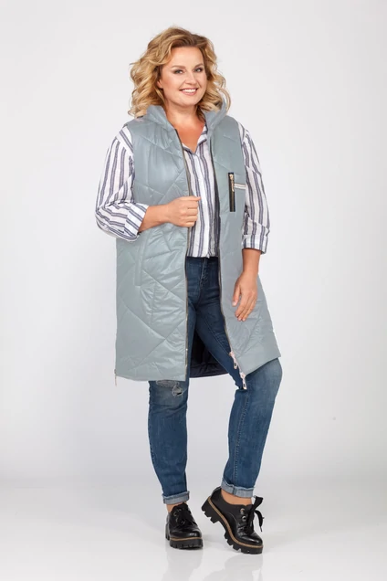 Жилет утепленный "А"- образного силуэта с капюшоном. Застежка на декоративной молнии, карманы с листочкой. В боковых швах функциональная молния, низ фигурный.
