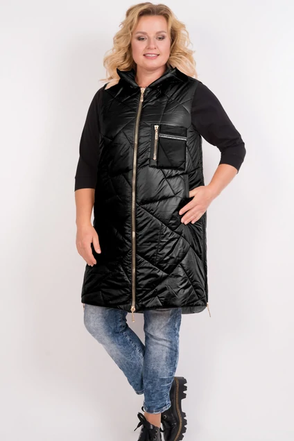 Жилет утепленный "А"- образного силуэта с капюшоном. Застежка на декоративной молнии, карманы с листочкой. В боковых швах функциональная молния, низ фигурный.