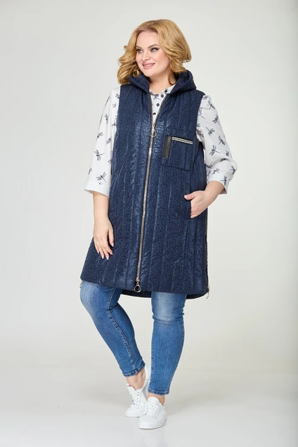 Жилет утепленный "А"- образного силуэта с капюшоном. Застежка на декоративной молнии, карманы с листочкой. В боковых швах функциональная молния, низ фигурный.