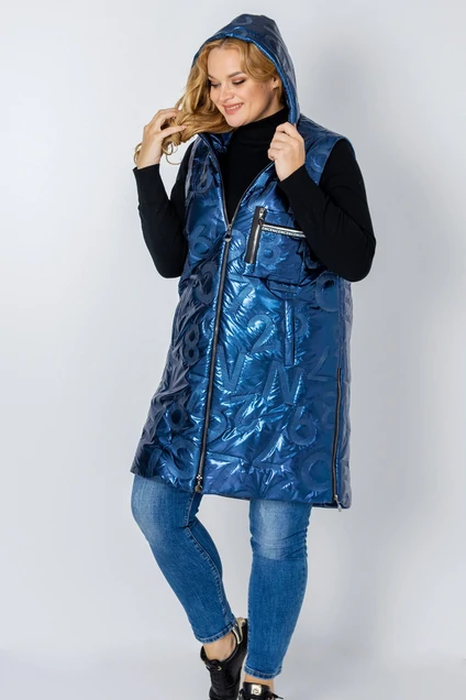 Жилет утепленный "А"- образного силуэта с капюшоном. Застежка на декоративной молнии, карманы с листочкой. В боковых швах функциональная молния, низ фигурный.