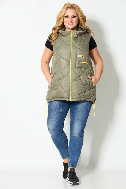 Жилет из стеганного полотна с яркой фурнитурой, фигурным, присборенным на шнуры с фиксаторами низом, удобными карманами.Длина по спинке 77 см.