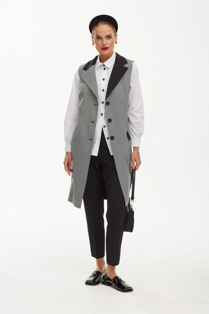 Женский удлиненный жилет в узор гусиной лапки — это стильный и практичный элемент гардероба, который идеально дополняет разнообразные образы. Он изготавливается из высококачественных материалов, обеспечивающих комфорт и долговечность, а также обладает великолепно продуманным кроем, который подчеркивает фигуру и добавляет элегантности.