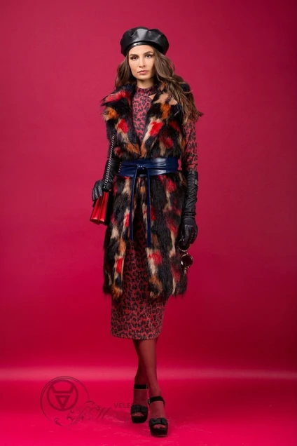 Жилет прямого силуэта. Выполнен из искусственного меха, на стеганной подкладке. Застежка спереди на три пришивные кнопки. Воротник отложной с лацканами. По боковым швам вставлены карманы, Жилет декорирован отделочной тесьмой с пайетками по боковым. Длина 102.