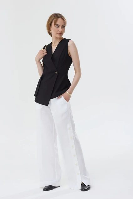 Limited Edition!Жилет льняной прилегающего силуэта. Застежка двубортная на петлю и пуговицу. Вырез горловины V-образный. Низ фигурной формы.  На переде карманы в швах. Жилет на хлопковой подкладке. Длина 63 см.