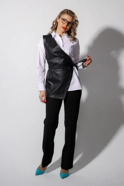 Универсальный жилет из искуственной кожи. Жилет на одно плечо. Прекрасно дополнит брючный и юбочный. Может применяться с платьями разного кроя, длины, а так же фактуры и цвета ткани. Модель выполнена таким образом, что с легкостью подстраивается под параметры хозяйки.